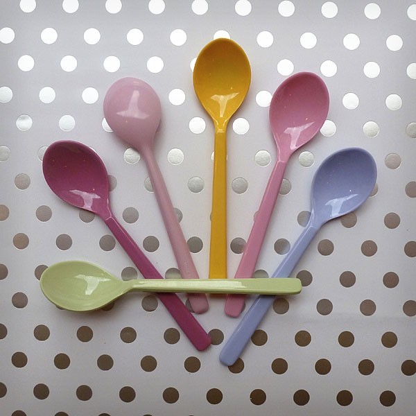 6 petites cuillères en mélamine dans des tons de roses.