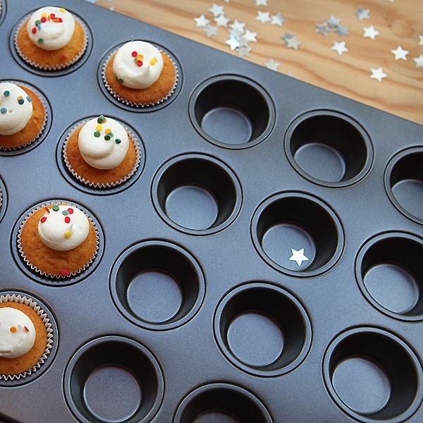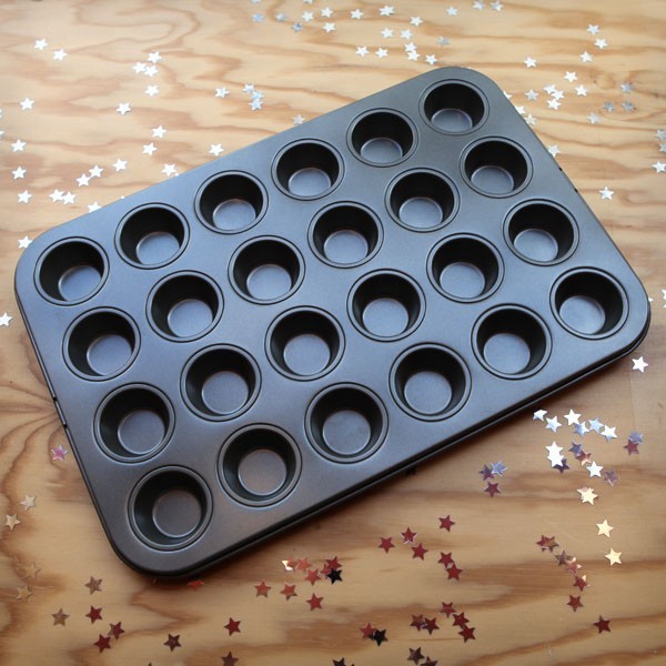 Moule anti-adhérent d'excellente qualité pour réaliser 24 minis muffins ou autres petites bouchées. Toutes nos mini-caissettes sont parfaitement adaptées à ce moule et inversement.
