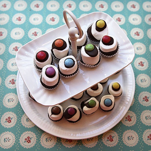 Plat à gâteaux à 2 étages en porcelaine blanche. Les bords plats sont plissés à la façon des caissettes en aluminium. Hauteur 25 cm.