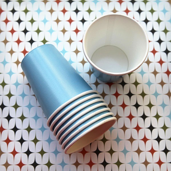8 gobelets en carton résistant de 270 ml : 8 cm de hauteur, 6 cm de diamètre.